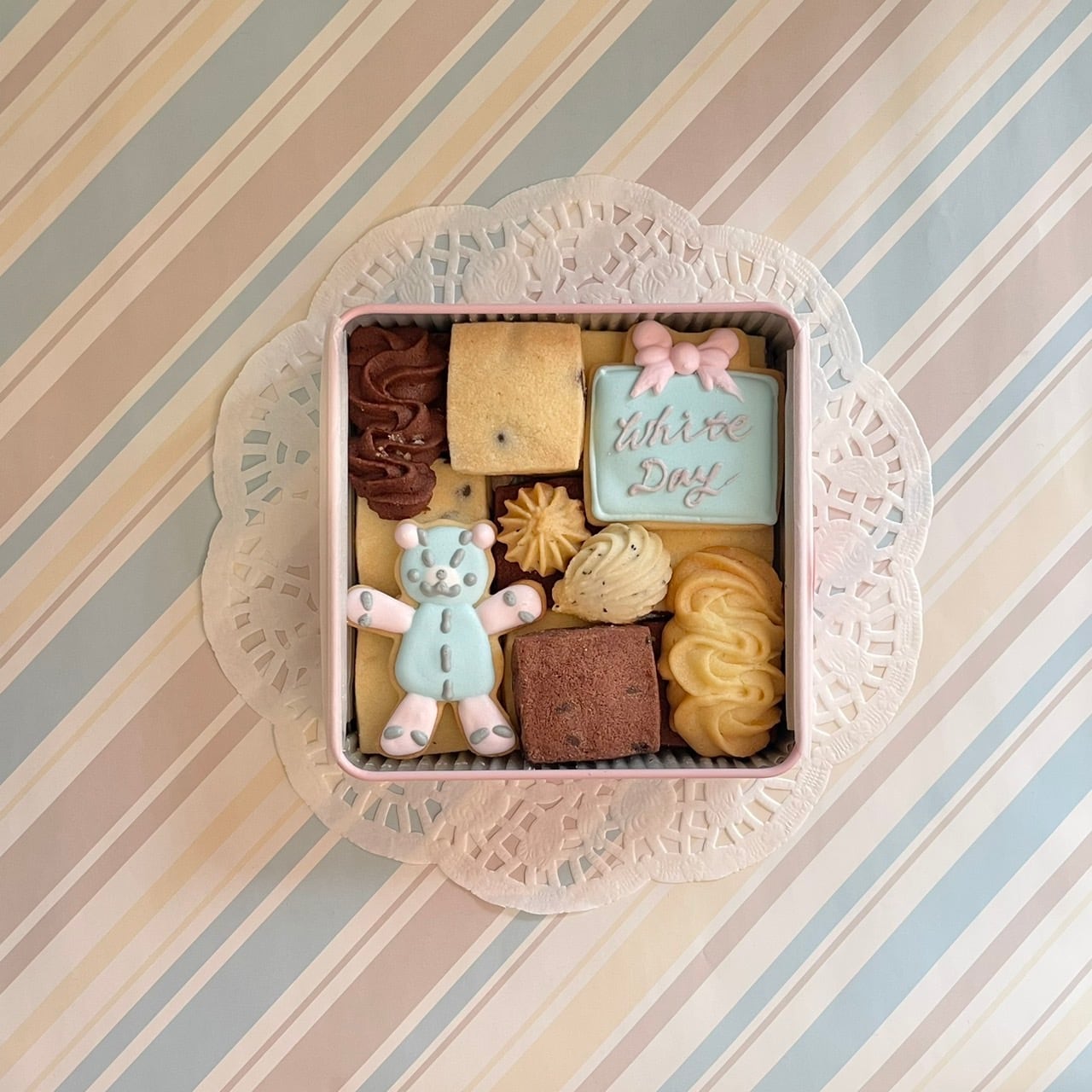 テディーベアとプレゼント型のアイシングがとってもキュートなホワイトデークッキー缶です